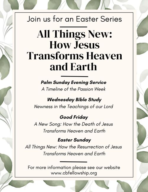 Passion Week refers to the time from Jesus’ triumphal entry into Jerusalem to his glorious resurrection. As we approach the time of the year when we remember the Passion week, we will look at how Jesus makes all things new and what that means. You will see the schedule for the series “All Things New: How Jesus Transforms Heaven and Earth,” below.